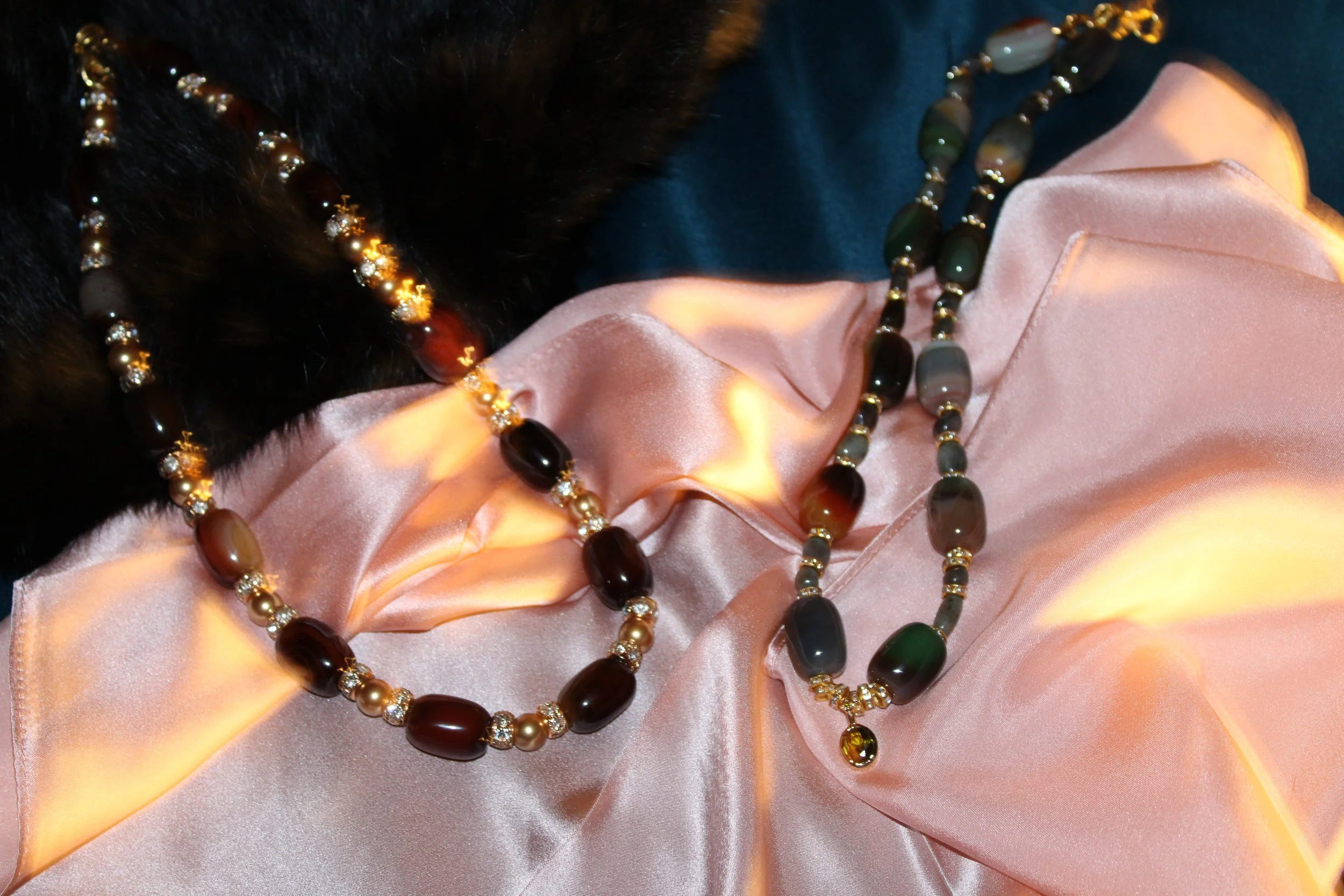At Sapphire Coded, we mix the jewelry between a range of gold plated pendants, polymer clay, precious and semi precious stones, glass pearls, freshwater pearls, and glass beads.